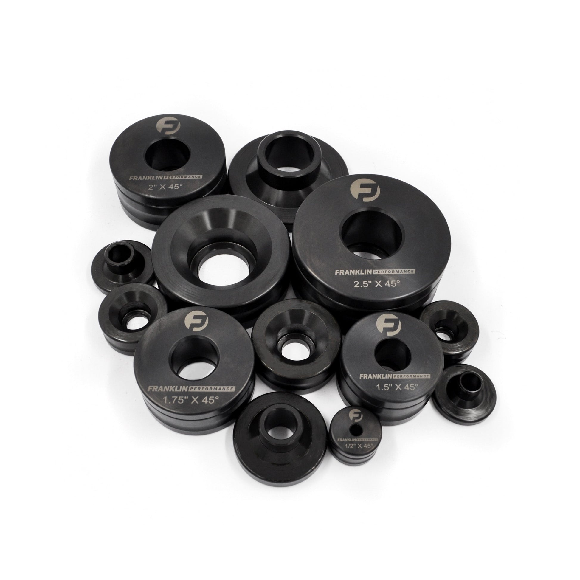 The dies work great in a press or ironworker, and the smaller sizes can also be used with a nut & bolt on lighter steel or aluminium.